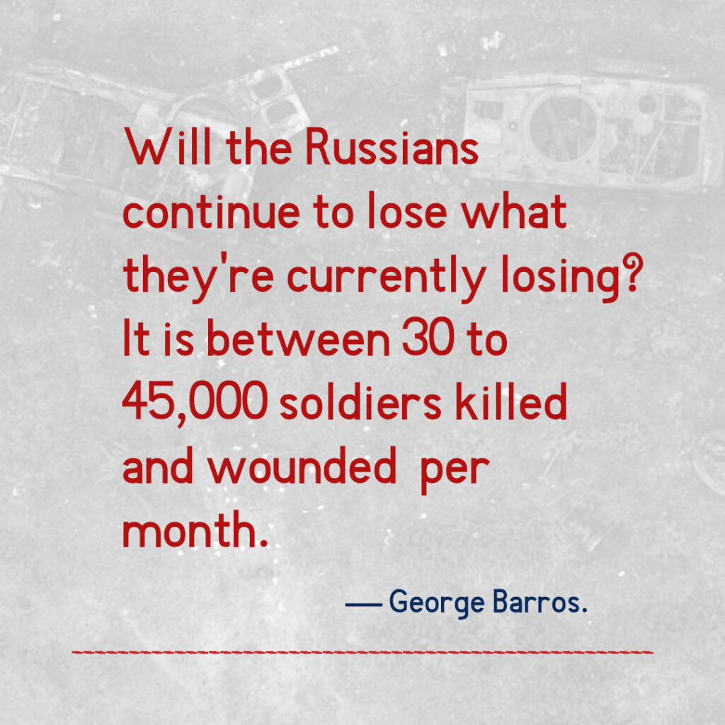The biggest and most decisive factor is: what is the attrition ratio? Will the Russians continue to lose what they’re currently losing? It is between 30,000 to 45,000 soldiers killed and wounded per month. Now, if the attrition ratio goes down—perhaps because Western support for Ukraine decreases, or perhaps because the Ukrainians become much less effective in their fighting—then the Russian ability to sustain and protract the war will in turn go forward. So, one of the most important things is to nail down as many of the unknown factors as possible—that is, to be sure we can count on Ukraine’s ability to continue extracting the very high casualty rates against the Russians at the current tempo.