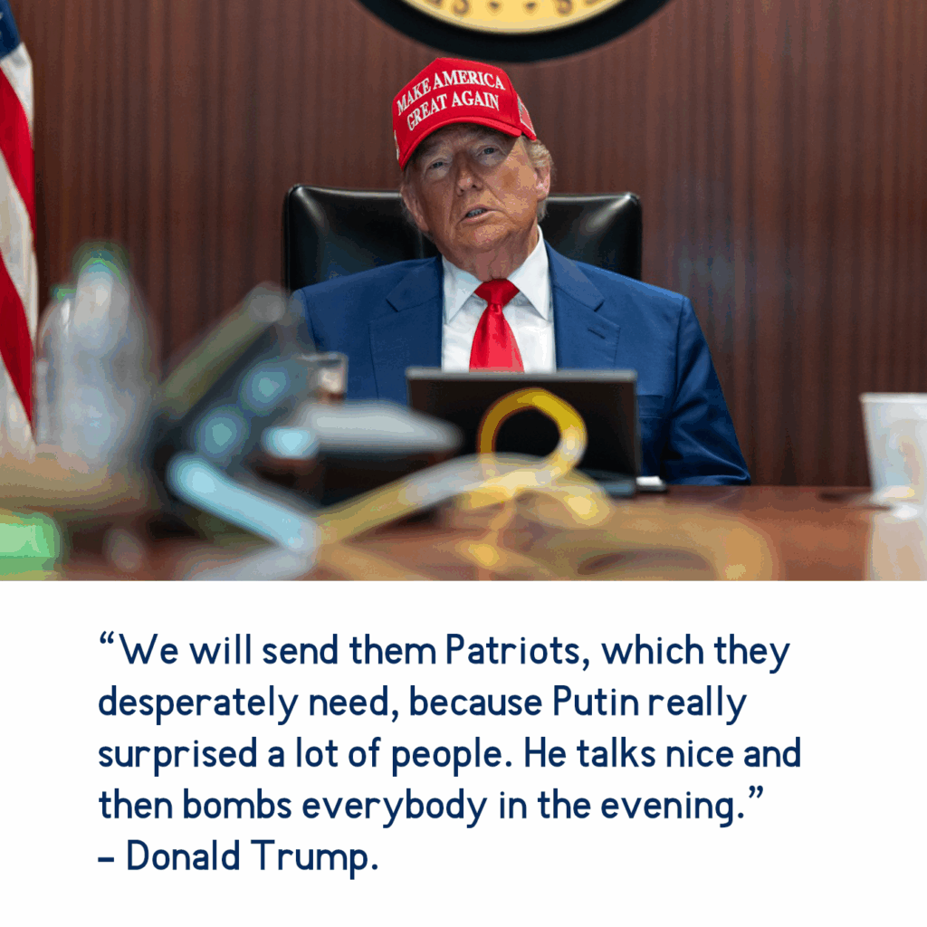 That notwithstanding, it tells us that President Trump is indeed going through a policy inflection. His previous position was that we’re not sending more weapons, and that the weapons we would send would just be the continuation of the previously approved Biden administration PDA [Presidential Drawdown Authority] aid. Now, when we have this inflection, which is we’re going to send them more weapons, even if he has to put the word “defensive” there, that’s a good thing.